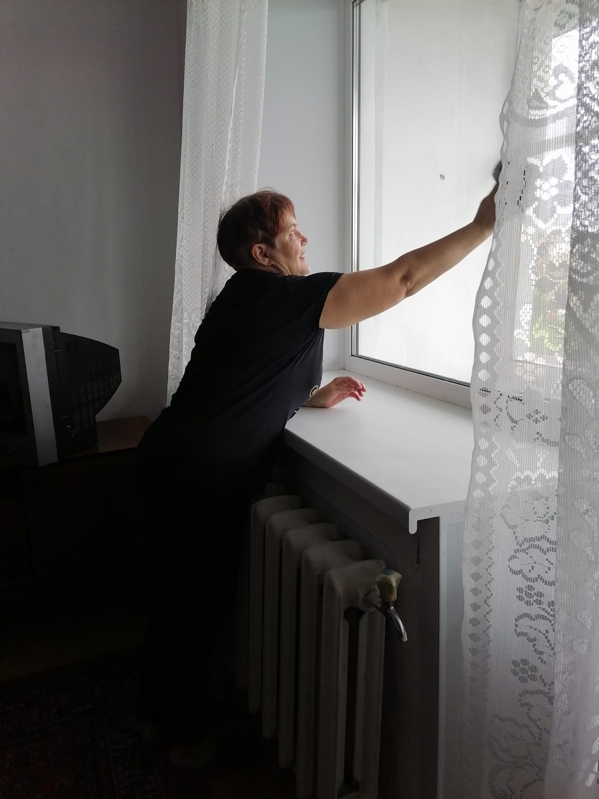 Социальные работники помыли окна и навесили шторы.